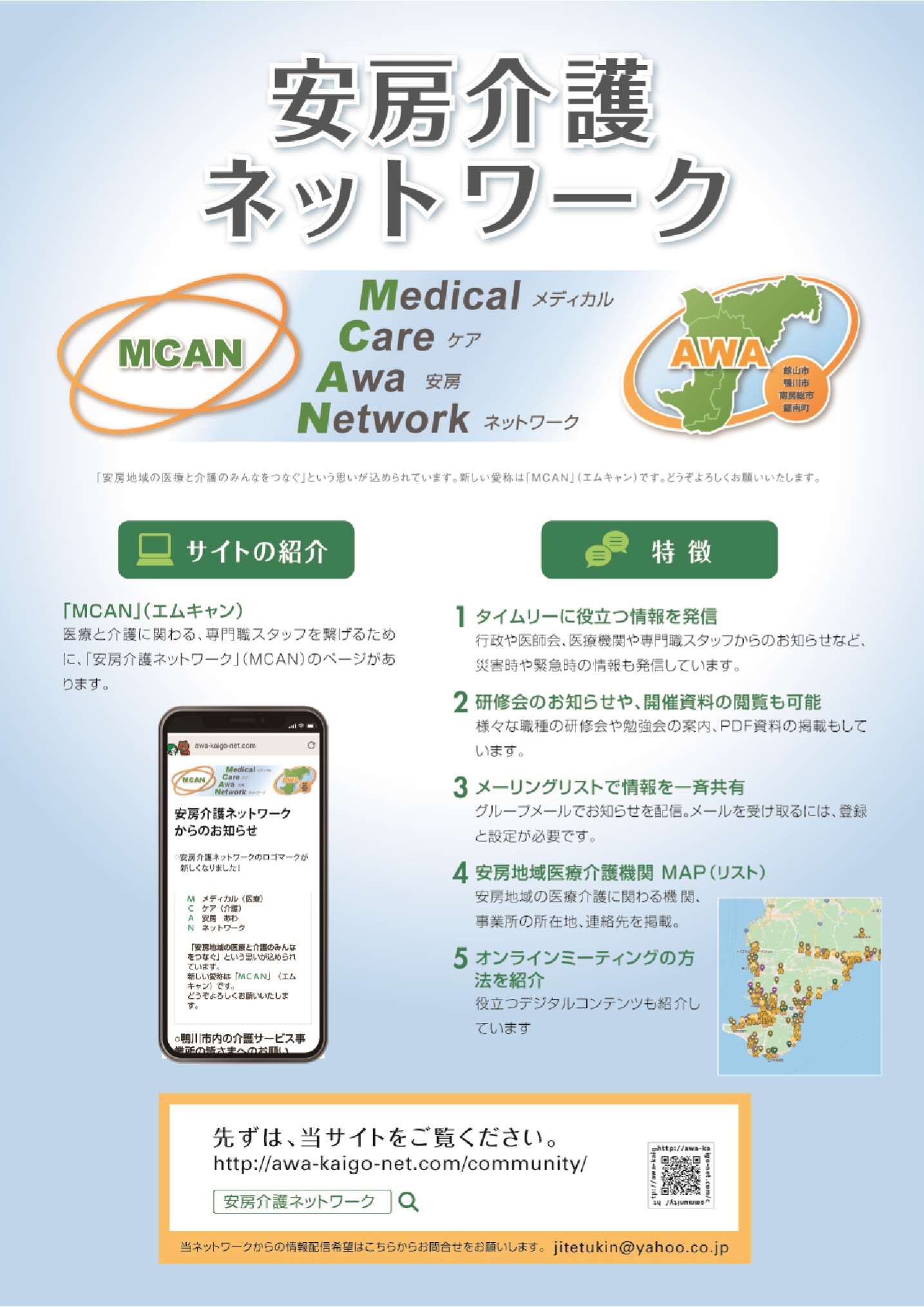 〇安房介護ネットワークの名称は「MCAN」です! M メディカル (medical) C ケア (care) A 安房 N ネットワーク 「安房地域の医療と介護のみんなをつなぐ」という思いが込められています。安房地域の医療と介護の方への情報発信にご活用下さい。